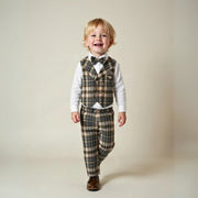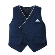 Let your little boy shine in this elegant 3-piece suit. The set includes a light blue shirt with a dark blue bow tie, a stylish waistcoat, and smart trousers. Perfect for weddings, birthdays, family gatherings, or any other special occasion where a festive look is desired. Thanks to the soft materials, the suit is comfortable while ensuring your child looks stylish and smart.